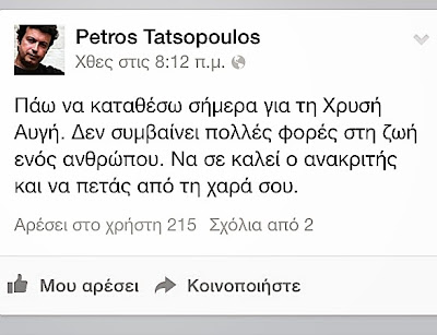 Ο γνωστός Τατσόπουλος του ΣΥΡΙΖΑ έγραψε χθες στην σελίδα του στο facebook, με αφορμή κατάθεση του: «Πάω να καταθέσω σήμερα για τη Χρυσή Αυγή. Δεν συμβαίνει πολλές φορές στη ζωή ενός ανθρώπου. Να σε καλεί ο ανακριτής και να πετάς από τη χαρά σου.»